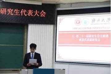 第二阶段会议听取了学院第二十届研究生会执行主席王子威同学所作的第二十届研究生会工作报告,对过去一年研究生会管理制度、团支部构建、活动开展等工作进行总结。学院第二十届研究生会执行主席陈东民同学宣读《雷竞技电竞平台官网第十四次研究生代表大会倡议书》,与会代表认真聆听和审议,一致表决通过倡议书。